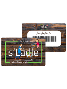 Unser Logo rund, dieses auf einem Holzbrett abgebildet ist. Auf diesem sind zwei gezeichnete Personen mit einem Einkaufwagen. Im oberen Teil ist der Slogan: (Frische. Genuss. Dahoim.), im mittleren Teil der Name (s'Lädle) und im unteren Bereich die Domain der Webseite (dein-sbmarkt.de) dieses umrandet, mit einem grünen Rahmen abgebildet ist.